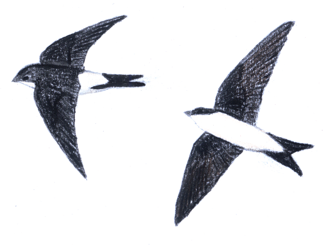 Größe/Gewicht/Aussehen:13 cm; ca. 20 g; Oberseite blauschwarz mit weißem Bürzel, Unterseite reinweiß; Schwanz gegabelt
